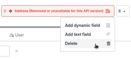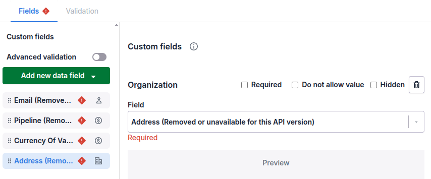 If there are any fields that need to be re-mapped, this is indicated with a red error icon in the menu on the Custom Fields tab: