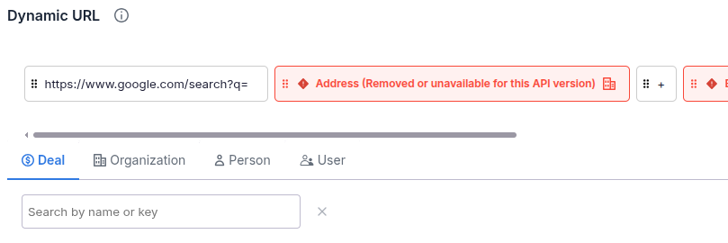 If any fields need to be re-mapped, this is indicated with a red error icon on the Dynamic URL tab: